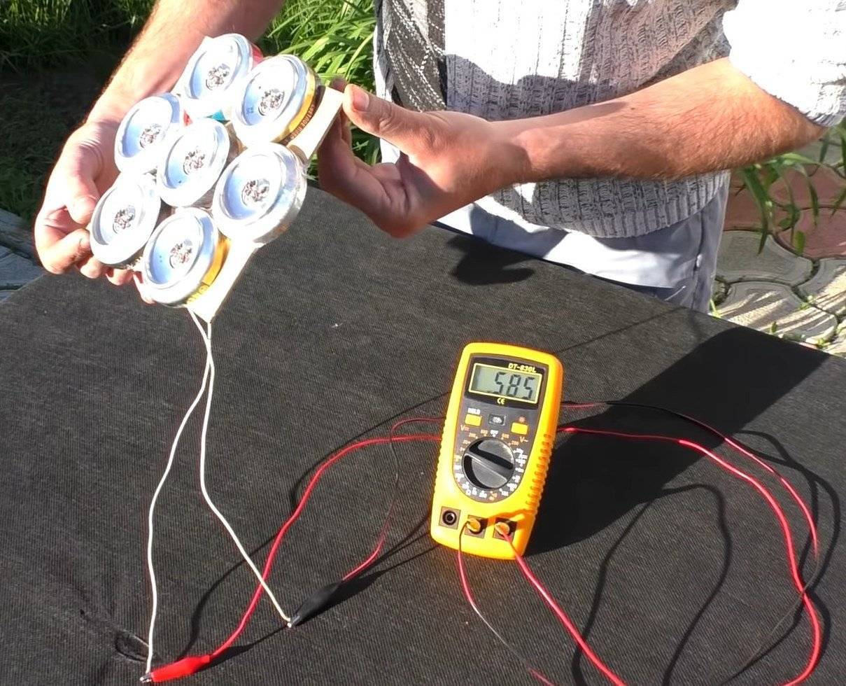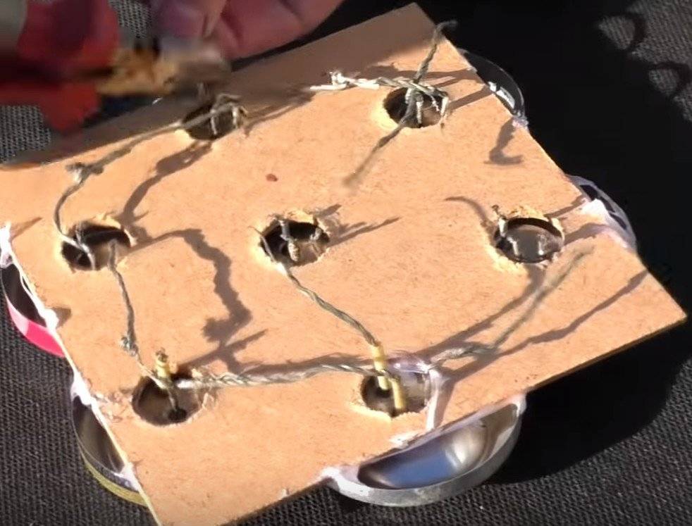 В качестве средства повышения эффективности панели из одного блока иногда используют алюминиевые банки. Такая солнечная батарея своими руками выглядит так:
