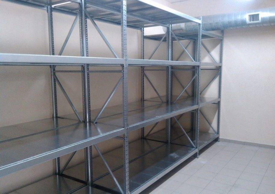 Обычно, для хранения очень тяжелых предметов или предметов с большими габаритами, применяются металлические полки. Для надёжного хранения вещей на них будет лучше, если они будут изготовлены, как стационарные конструкции.