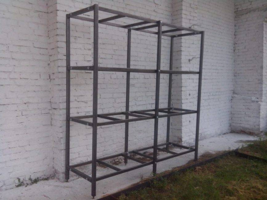 - Простота монтажа. Необязательно покупать готовую конструкцию. Ее можно изготовить и самостоятельно, даже не имея особых строительных навыков. Для этого потребуется профильная труба, стойки и материал для полочек.