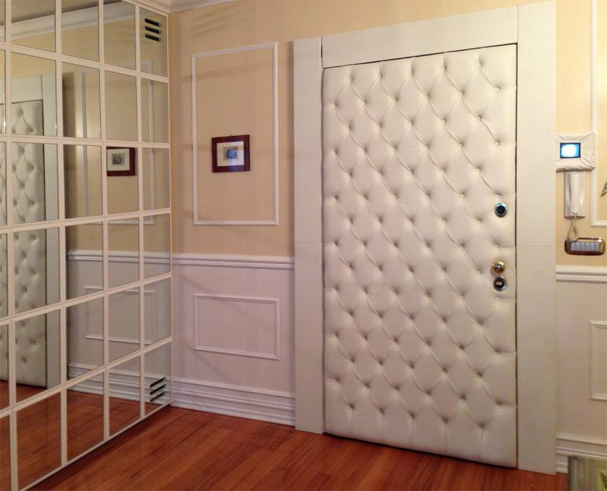 Эффективным методом утепления, а также звукоизоляции является обивка входной двери. Для данного метода используется искусственная кожа, поролон, вата. Для крепления применяются мебельные или обычные гвозди.