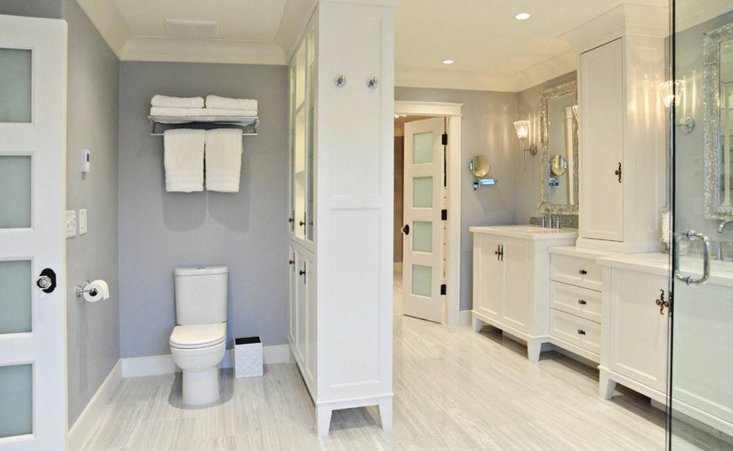 В просторной ванной комнате стеллаж-перегородку можно использовать для разделения зоны для водных процедур и туалета. В такой системе хранения можно разместить не только банные принадлежности и аксессуары для различных водных и санитарно-гигиенических процедур, но и запас полотенец для всей семьи.