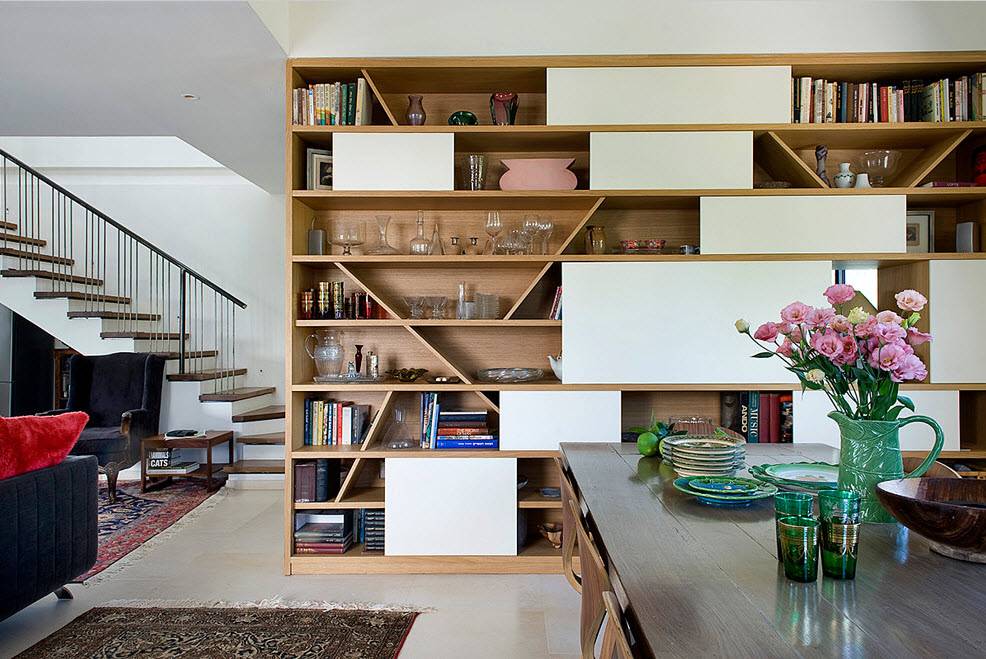 Помимо очевидных опций, среди которых использование стеллажа в качестве системы хранения и предмета зонирования, данный вид перегородки может выполнять и защитную функцию. Например, располагаясь возле лестницы, стеллаж-перегородка не только зонирует пространство, но и выступает в качестве перил, т.е. защитного экрана для тех, кто поднимается или спускается по ступеням. Аналогичную функцию выполняет стеллаж, расположенный на верхнем уровне помещения с несколькими функциональными ярусами.