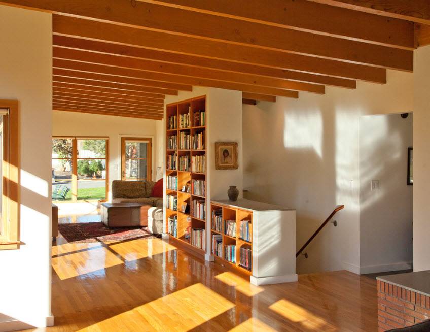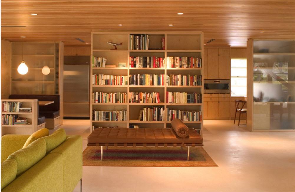 В просторных помещениях стеллажи-перегородки чаще всего нужны для зонирования пространства без использования сплошных стен. Можно и вовсе использовать невысокий стеллаж – иллюзия отделения пространства сохранится, а визуальный объем помещения и количество освещения практически не изменятся. Но в некоторых случаях необходим стеллаж-перегородка от пола и до потолка – такой прием зонирования не станет преградой в просторном помещении с несколькими окнами.