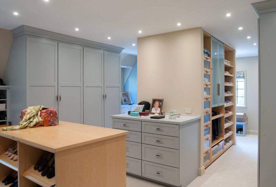 В спальне стеллаж можно использовать в качестве перегородки, отделяющей зоны гардеробной. Очевидно, что полки такой системы хранения будут занимать предметы гардероба хозяев. Стеллаж можно сделать прозрачным или использовать стенку, но со стороны спальной зоны – можно повесить картину или телевизор.