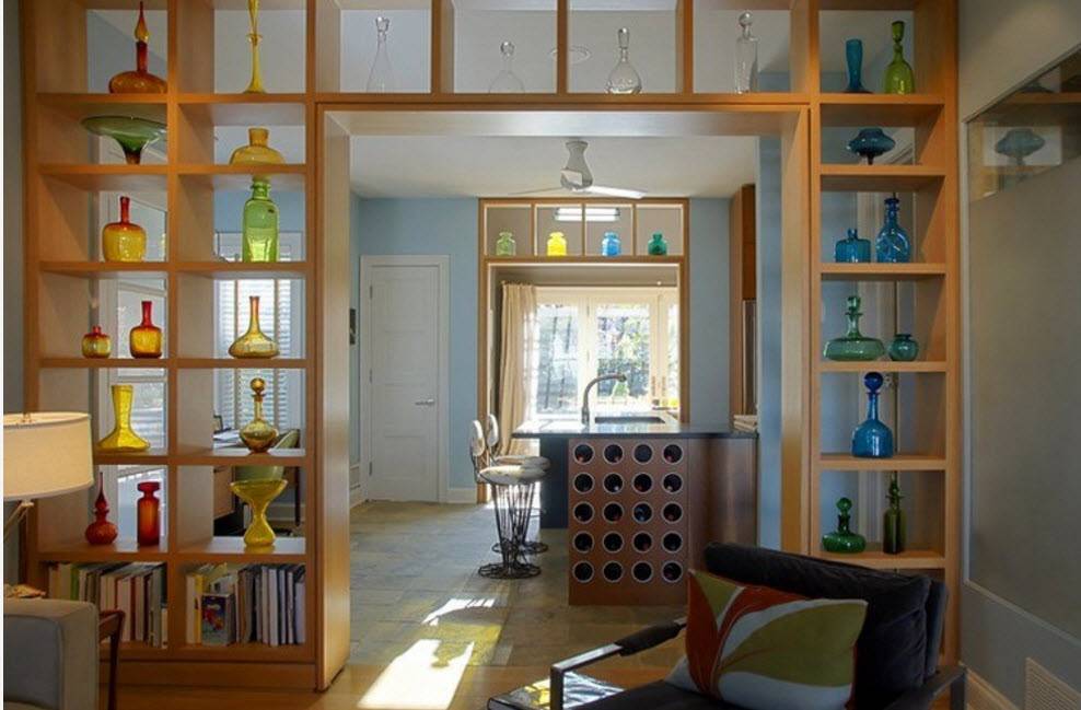 Помимо этого, стеллаж может выступать в качестве акцентного элемента интерьера, привлекая всеобщее внимание и отвлекая от неудачных элементов обстановки. Также стеллаж-перегородка может выступать в качестве декоративного элемента, украшая интерьер, привнося нотки оригинальности при помощи креативного дизайна