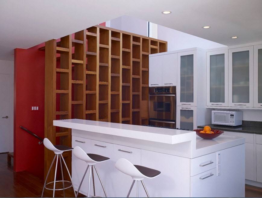 Еще один вариант разделяющей перегородки для кухонной зоны в общем помещении – надстройка стеллажа над полуостровом или барной стойкой. Практичный с точки зрения своего основного предназначения кухонный полуостров становится частью перегородки. Обычно добавление в виде стеллажа сводится к возведению лаконичных открытых полок над столешницей.