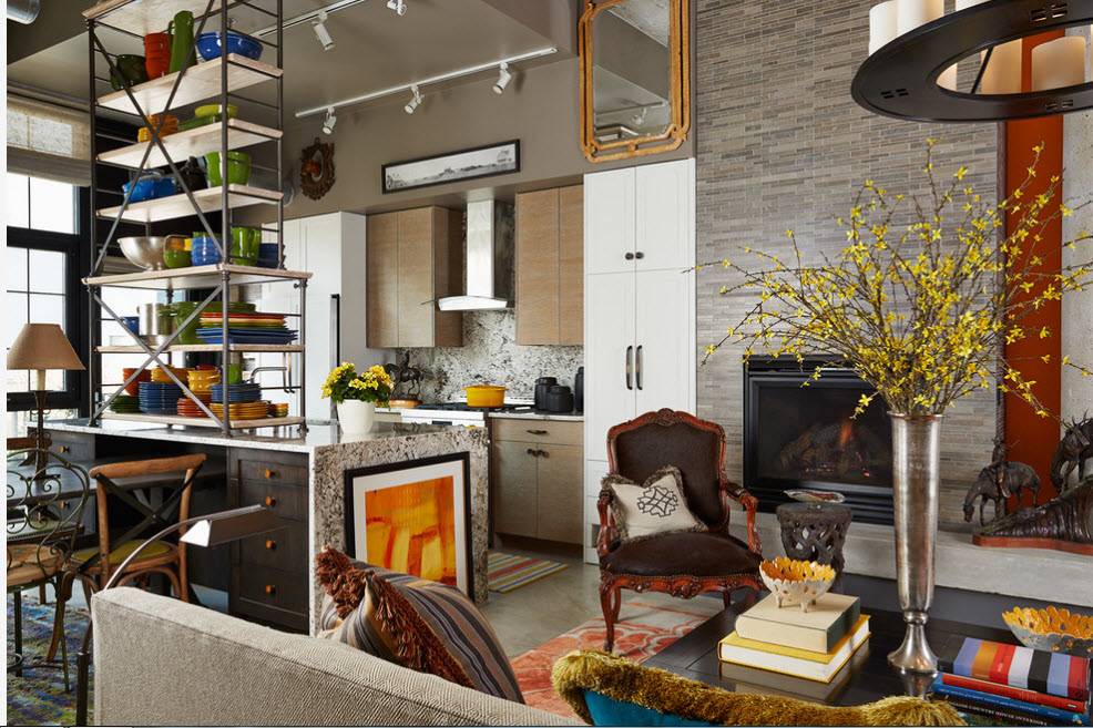 Если в квартире-студии рабочую и обеденную зону кухни-столовой отделяет от пространства гостиной стеллаж-перегородка, то в нем одинаково эффективно будет хранение предметов, которые могут понадобиться во всех перечисленных функциональных сегментах. Это может быть красивая посуда, книги по кулинарии, бытовые приборы или просто декоративные предметы, гармонично вписывающиеся в созданную обстановку.