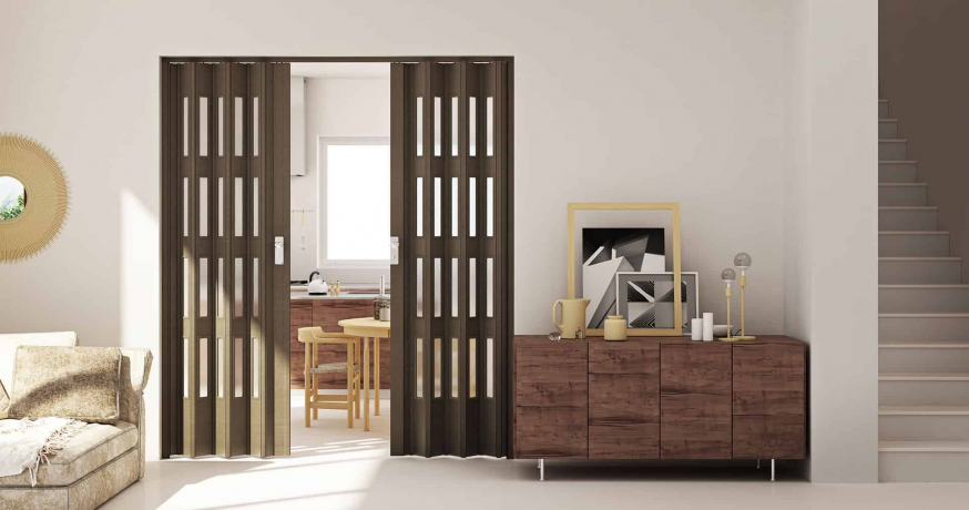 Похожи на ширмы, для них необходимы направляющие, расположенные как сверху, так и сверху и снизу. Такие двери производятся из дерева или пластика. Выпускаются и глухие, и остекленные двери.