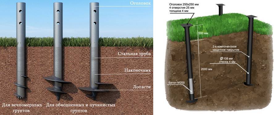 Выбор конкретного варианта заделки столба зависит, насколько влажен и плотен грунт. Например, когда грунт тяжёлый и глинистый, то достаточно выкопать ямы, поместить в них стальные трубы и залить бетонным раствором.