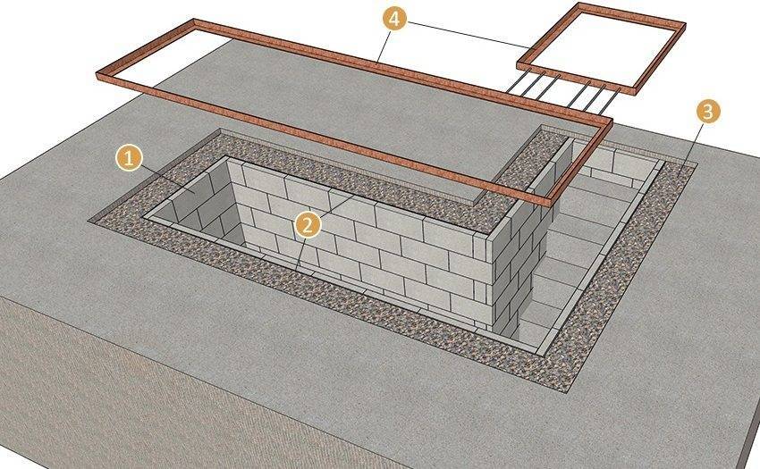 Схема обустройства смотровой ямы: 1 — стенки из пеноблоков, 2 — гидроизоляция, 3 — бутовая кладка. 4 — уголок размером 50х50х4 мм