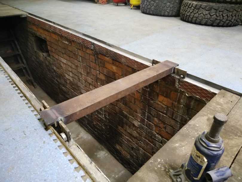 Далее стенки выгонялись почти в уровень с полом гаража. Часть стен была заменена двумя отрезками швеллеров. В низ при необходимости упираются домкраты. На верхний ряд укладывается металлический уголок с полкой 50 мм, толщина стали 5 мм.