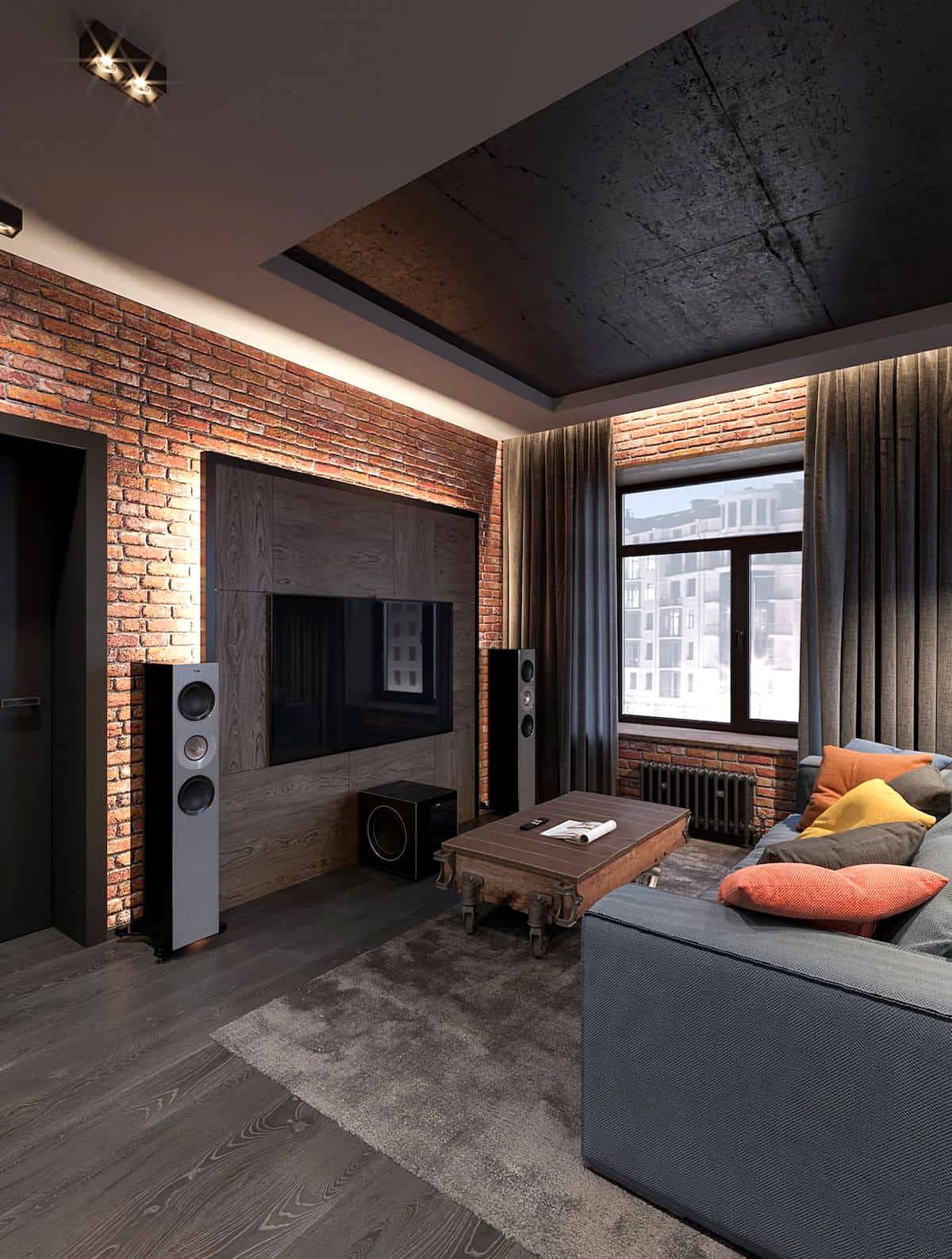 Нестандартный вариант, который требует особенно творческого подхода. Он позволяет сочетать кирпичные стены и бетонные перегородки без дополнительной отделки с уютными элементами декора помещений.