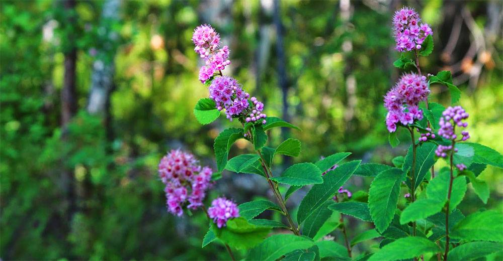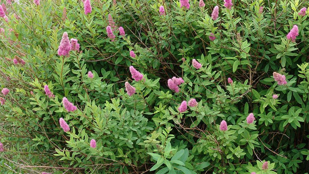 Спирея Билларда – гибрид спиреи Дугласа и иволистной. Это небольшой раскидистый куст с широкими листьями и розовыми цветками, собранными в пирамидальные соцветия. Период цветения – все лето.