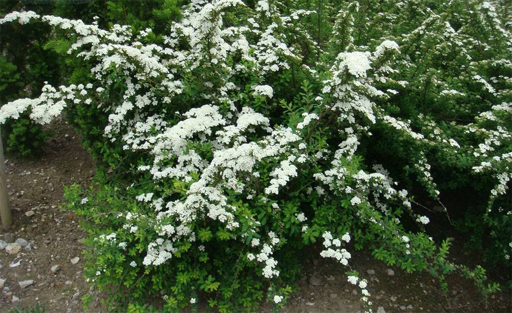 Ниппонская – шаровидный куст высотой около 1,5 метров. Отличается круглыми листьями и белыми цветками, облепляющими побег. Начинает цвести в мае, период цветения длится 3 недели. Она морозоустойчива и не требовательна к почве. Самые популярные сорта – Сноумаунд и Халвордз Силвер.