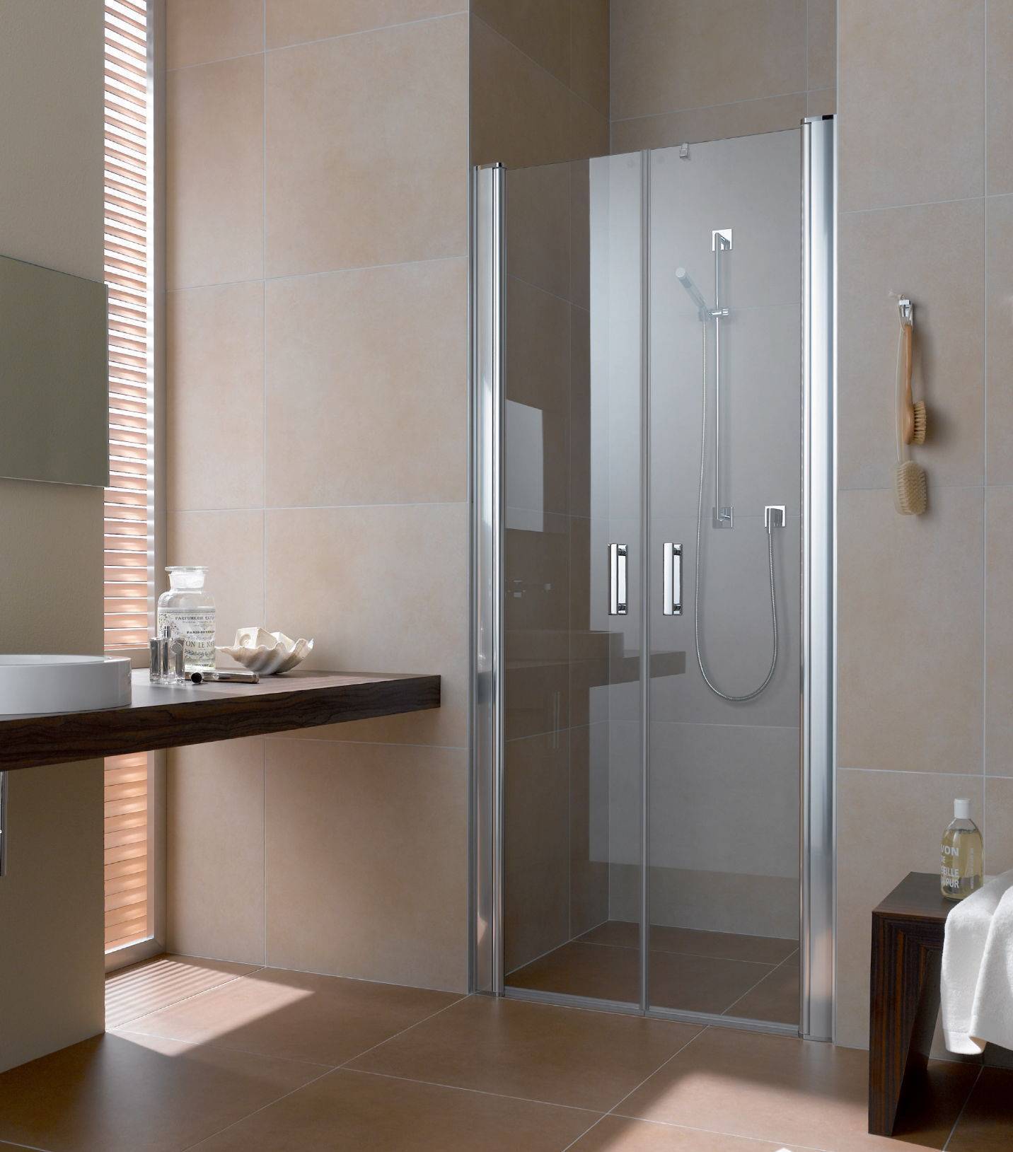Для широких ниш есть варианты с двойными раздвижными дверями или комбинация из распашной двери с узкой боковой стенкой. Это делает возможным установку душевой двери практически в любой нише.