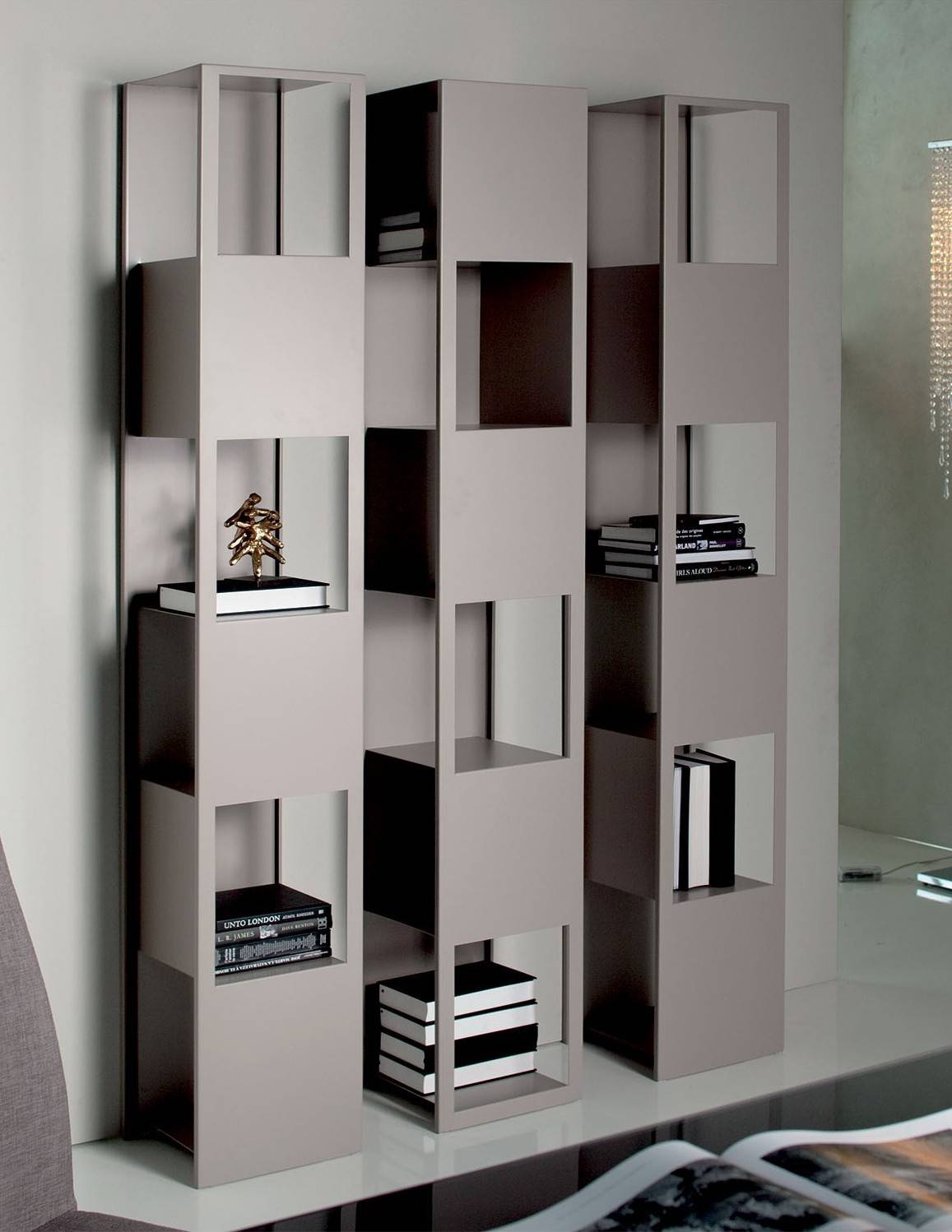 Другой вариант открытого стеллажа, разработанный дизайнером Марком Даниилом. Белый книжный шкаф с сегментированными глянцевыми полками также может быть использован в качестве разделителя комнаты.