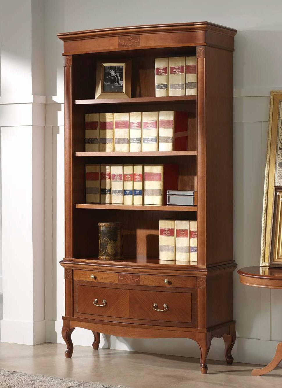 На этом фото виден классический стеллаж. Его каркас создан из толстых деревянных брусьев, выкрашенных в белый цвет, что делает его не только надежным, но и невероятно стильным.