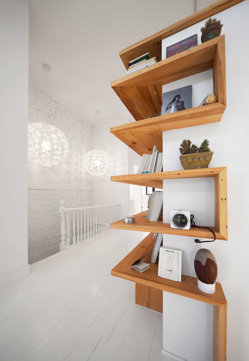 Встроенные модели идеально подходят для нестандартной планировки. Они занимают неприглядные проемы стен, их ставят на мансардном этаже или под лестницей. Теперь часто задаваемый вопрос: «Как разместить стеллаж в интерьере?» снят с повестки дня.