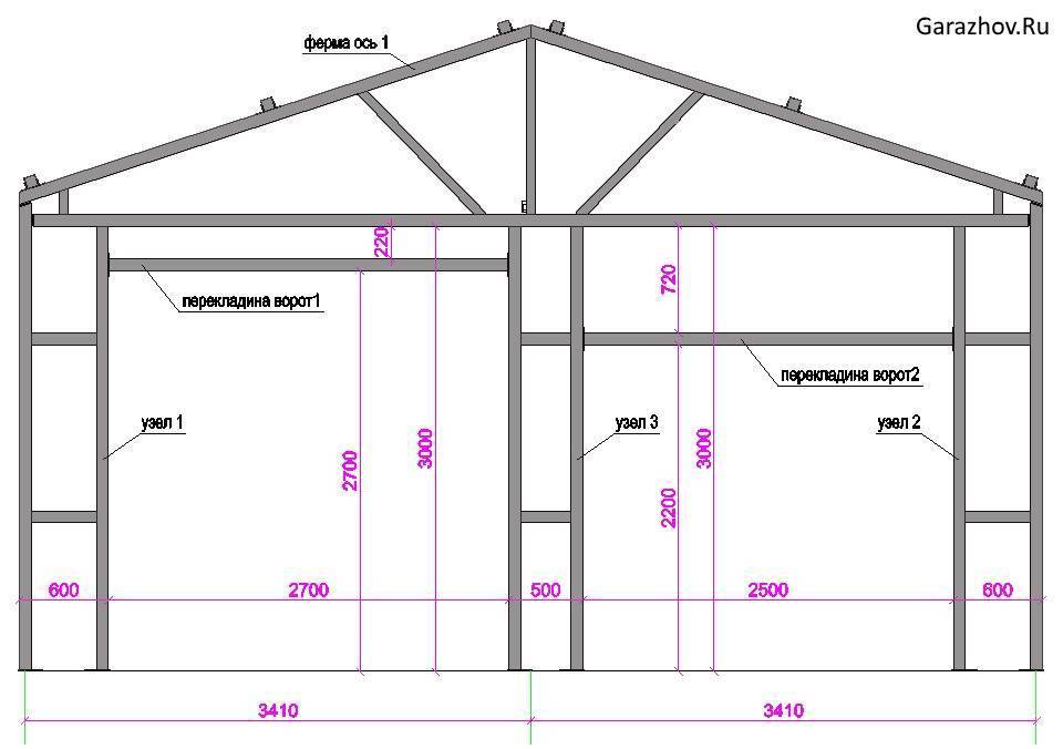 Если предусмотрена двускатная крыша, то необходимо собрать фермы (треугольной формы). Две крайние + промежуточные (для повышения прочности кровли). Количество последних определяется в зависимости от длины гаража. Данная конструкция, как правило, монтируется на земле, а потом поднимается и крепится на каркасе бокса.
