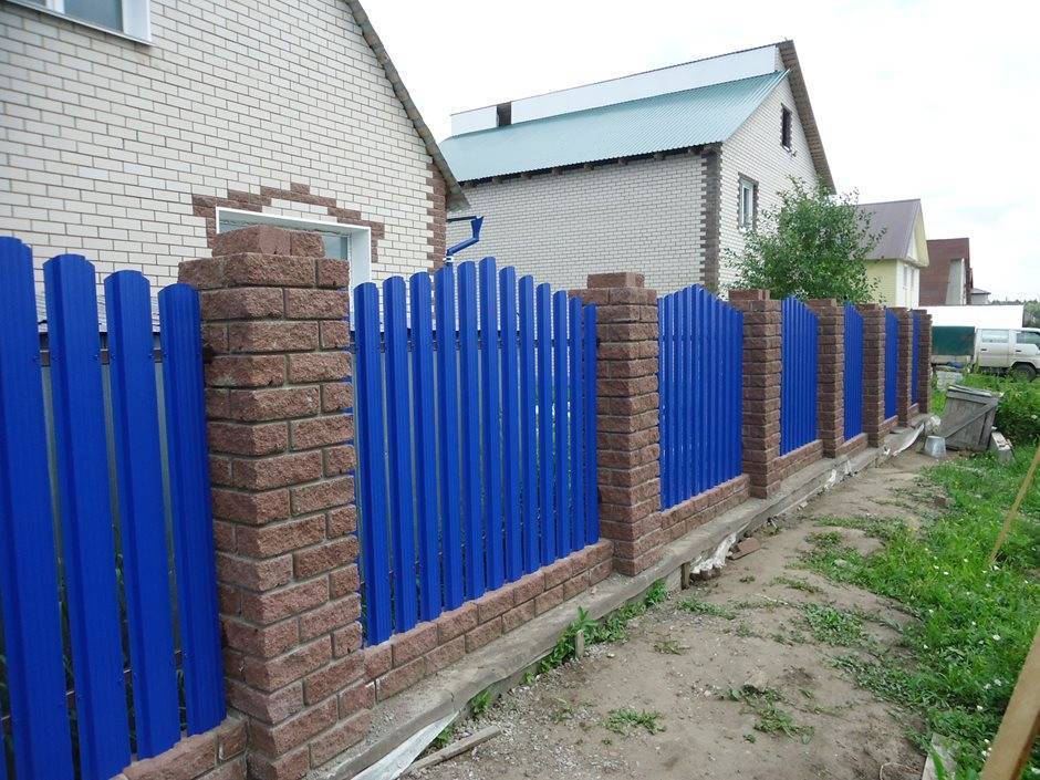 Есть еще несколько разновидностей заполнения пролетов (расстояния между опорными столбами). Проще всего в монтаже прямой способ — это когда все планки одной длины. Поверх такой ограды можно пустить П-образную планку из того же материала (продается там же где и евроштакетник). Кроме эстетической нагрузки, она еще прикрывает срезы металла, что увеличивает срок службы забора.