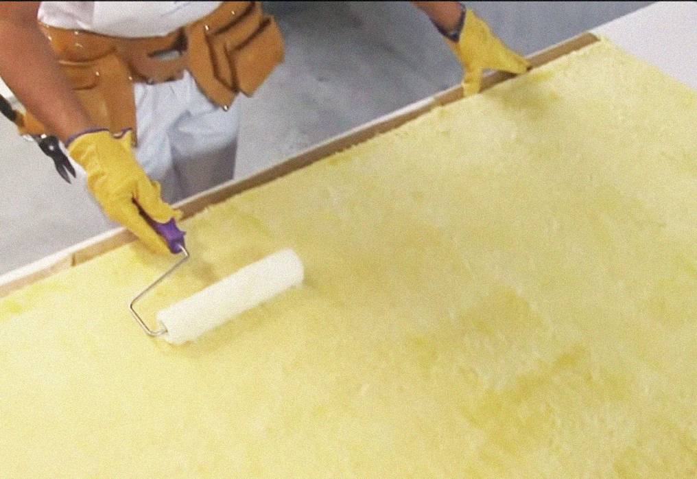 - Промазывать клеем необходимо основание и покрытие. Перед склеиванием нужно выдержать технологическую паузу пятнадцать минут.