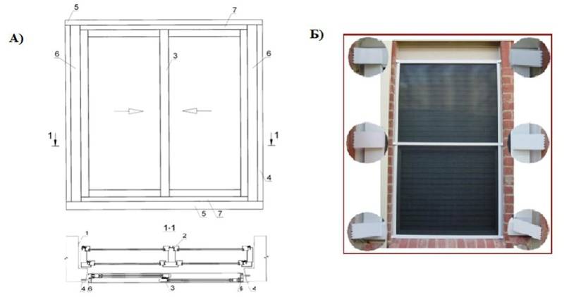 Рис. 3. НОШЭ: А 1 — оконный проем; 2 — существующий оконный блок; 3 -створки окна; 4 — фартуки, закрывающие боковые зазоры; 5 — зазоры; 6 — вертикальные стойки крепления; 7 — направляющие, Б крепление НОШЭ к раме