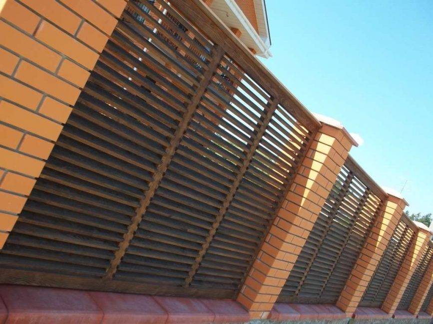 Как и в первом случае, кирпич служит в качестве материала для сооружения несущих элементов: столбов, нижних перекладин и других конструкций. Промежуток между столбами заполняют штакетником или досками, которые могут закрепляться разными способами.