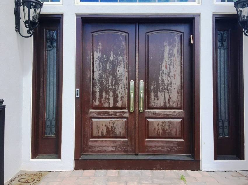 - появление трещин. Если трещины возникли на изделии, выполненном из качественной древесины, причиной может оказаться попадание прямых солнечных лучей. Стоит оценить, достаточно ли навес защищает дверь от солнечного света.