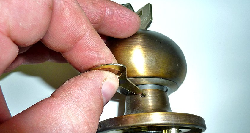 - Чтобы установить кноб, сначала её разбирают. Сбоку имеется технологическое отверстие, внутри которого расположен фиксатор – язычок. При нажатии его ключиком рукоятка легко снимется.