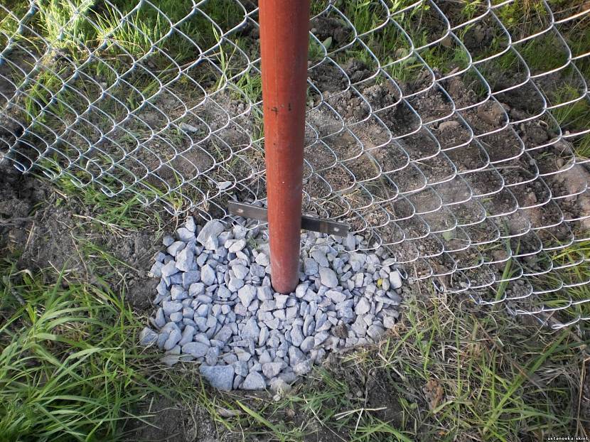 Монтируется первый столб, подгоняется под уровень и присыпается щебнем, кирпичами или другими стройматериалами.