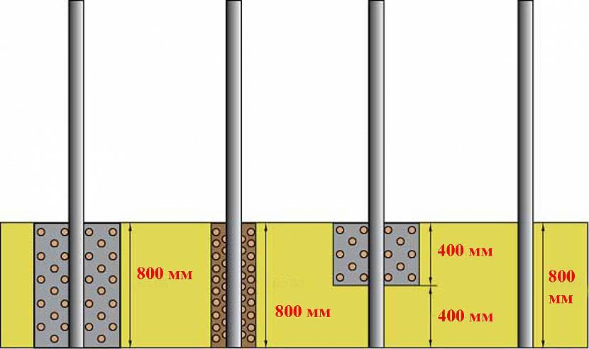 - полное бетонирование – самый оптимальный способ установки опор для всех видов заборов, кроме массивных и тяжёлых: кирпичных, каменных, бетонных;