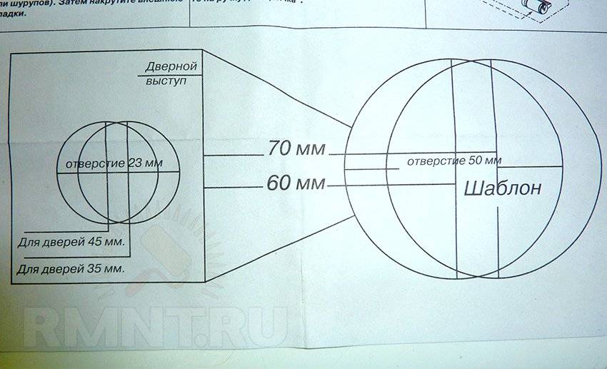 Облегчить монтаж поможет шаблон для установки дверных ручек, продающийся вместе с изделием. Если такового не оказалось в упаковке, его можно распечатать с интернета. Шаблон представляет собой схему корпуса механизма в масштабе 1:1. Её прикладывают к полотну для разметки паза и отверстия. Если предполагается устанавливать большое количество ручек, из дерева вырезают кондуктор для сверления.