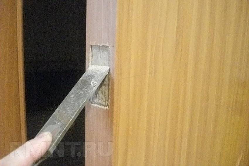 14. При закрытой двери помечаем место касания язычка защёлки дверного косяка, после чего выдалбливаем в полученном месте углубление под язычок защёлки.