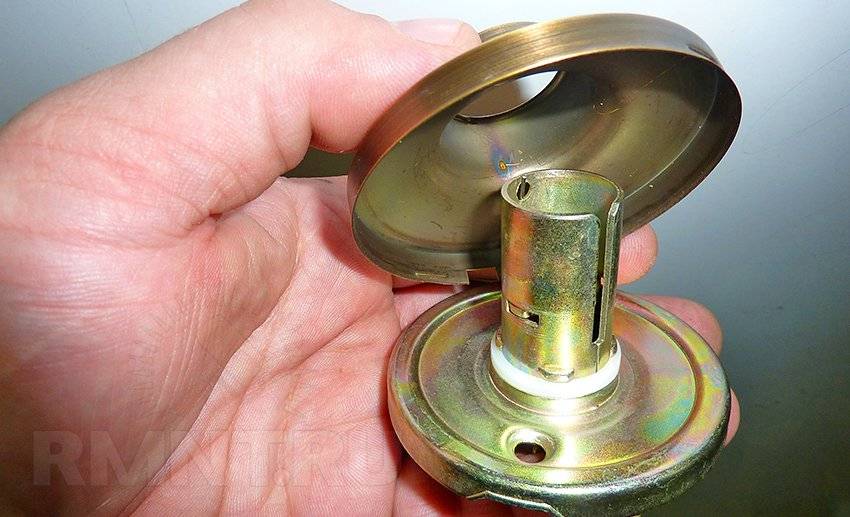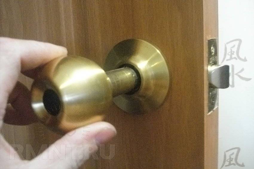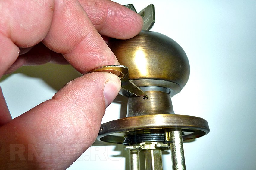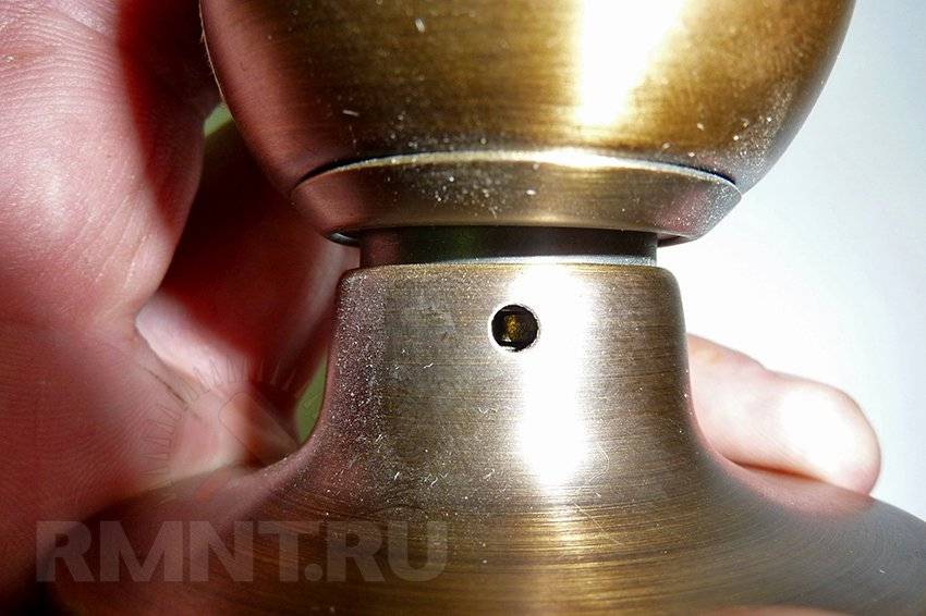 - Чтобы установить кноб, сначала её разбирают. Сбоку имеется технологическое отверстие, внутри которого расположен фиксатор – язычок. При нажатии его ключиком рукоятка легко снимется.