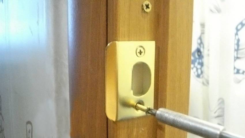 На последнем этапе при установке нашей дверной ручки нужно смонтировать ответную часть защелки в коробке. Чтобы все получилось, смазываем маслом язычок, закрываем дверь и делаем отметину на косяке язычком, делая уже собранной до этого момента дверной ручкой пару движений по типу «открыть-закрыть». Следом нужно приложить накладку, проворачиваемую к косяку, обвести ее по контуру вместе с внутренним отверстием.