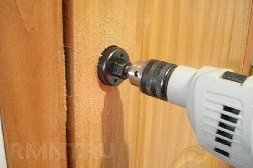 Для дальнейшей установки ручки кноб берут электродрель с коронкой и сверлят в полотне сквозное отверстие