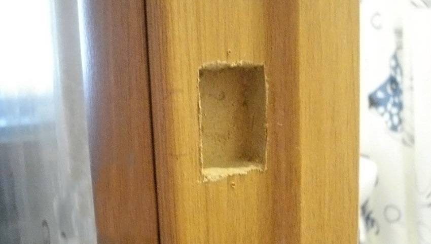 С торца створки на отмеченном центре сверлят перьевым сверлом отверстие. Его глубина и диаметр равен размеру корпуса защёлки