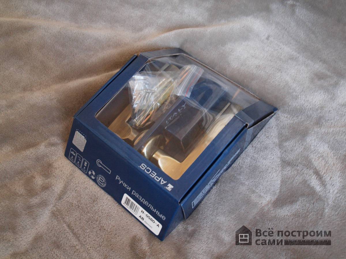 Рассматривать процесс установки будем на примере дверных ручек Apecs, весьма известных на российском рынке. Материал ручки – латунь, являющийся наиболее популярным на сегодняшний день. Простота обработки, сравнительно невысокая цена, приятная на ощупь – эти и другие преимущества стали по вкусу, как производителям, так и клиентам.