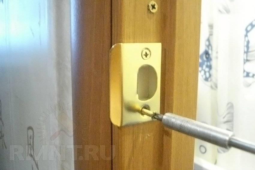 - При закрытом дверном полотне выполняется разметка лудки под ответную планку. После выборки стамеской углубления саморезами фиксируют пластину.