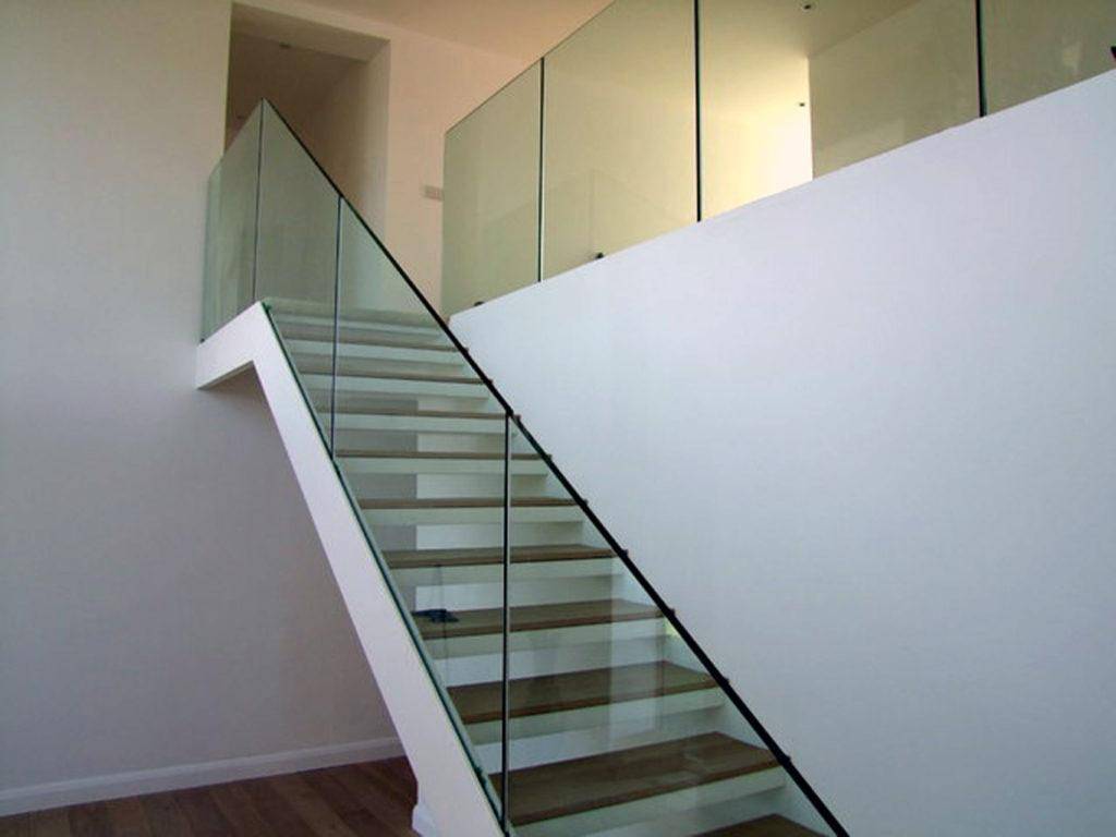 Лестничные ограждения из стекла на каркасе считаются более безопасными. Для их производства используется стекло толщиной 5-10 мм. Стеклянные панели сочетаются с опорами из нержавеющей стали, алюминия или дерева.