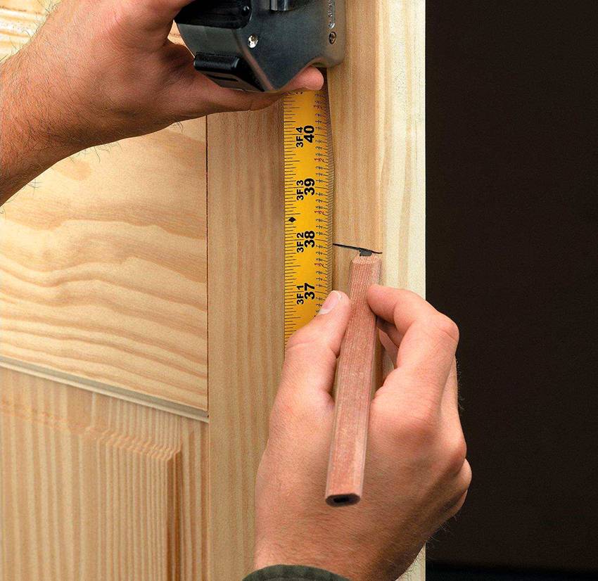 Сначала снимаем дверь и отмечаем место установки механизма. Потом отмеряем рулеткой расстояние от 1 до 1.5 метров до пола. Затем прикладываем замок и отмечаем место крепления.