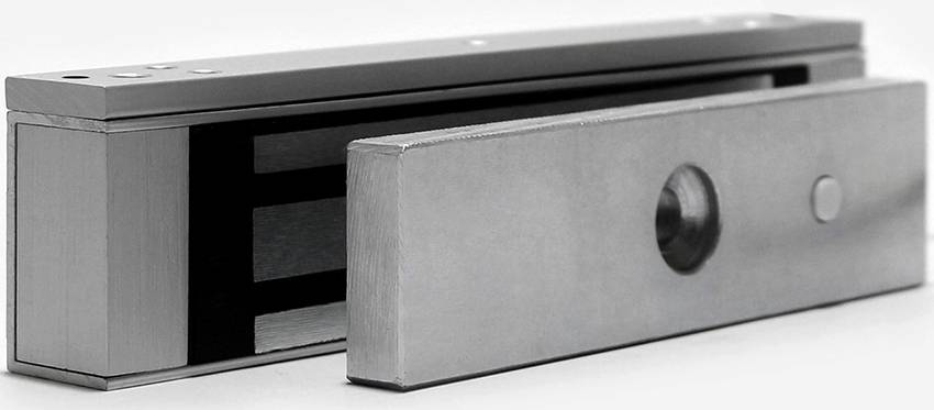 Магнитный замок. Стоимость таких приспособлений выше, чем цена стандартных разновидностей запорных механизмов. Основное их преимущество – бесшумность работы. Именно поэтому их чаще всего монтируют на межкомнатные двери, которые предназначаются для спален и детских комнат. Самостоятельно довольно сложно врезать замок в межкомнатную дверь. Цена установки магнитных механизмов зависит от особенностей их конструкции и типа двери.