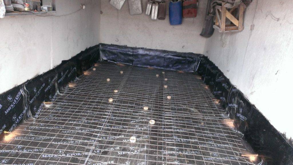 Важно. Гидроизоляция укладывается внахлест и с припуском на стены гаража, минимум 30 – 40 сантиметров