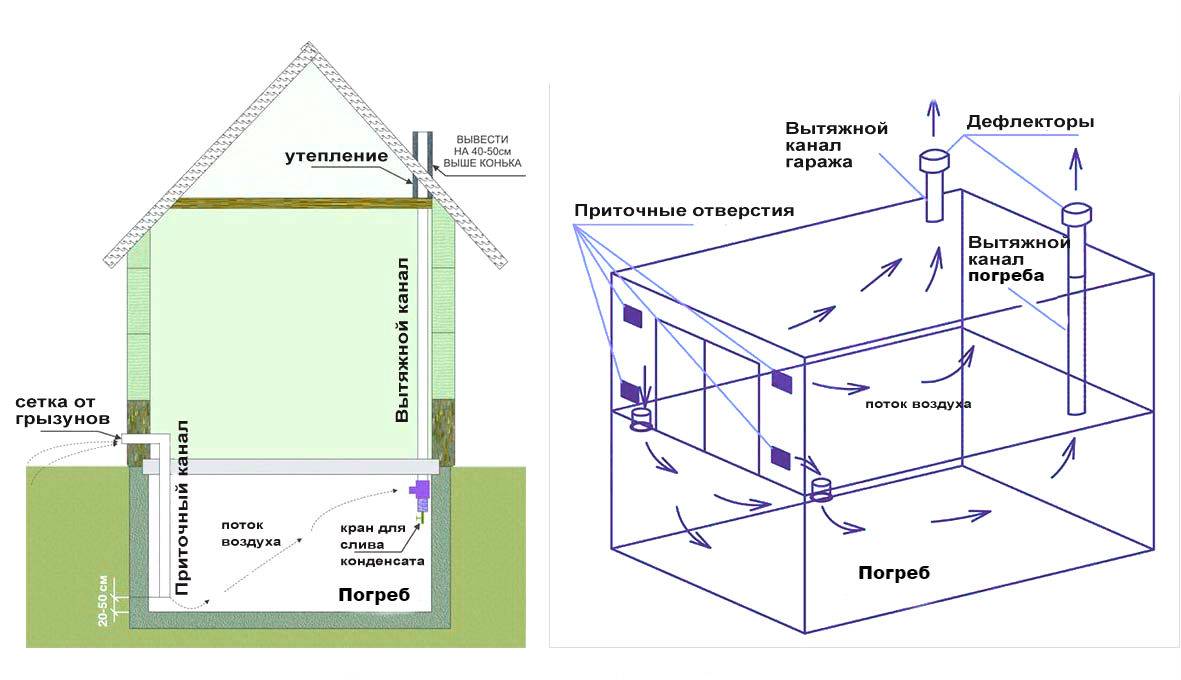 Свежий воздух нагнетается через воздуховод, прогоняется по яме, вытягивается вентилятором через второй вентиляционный канал, установленный автомномно либо совмещенный с подвальным.