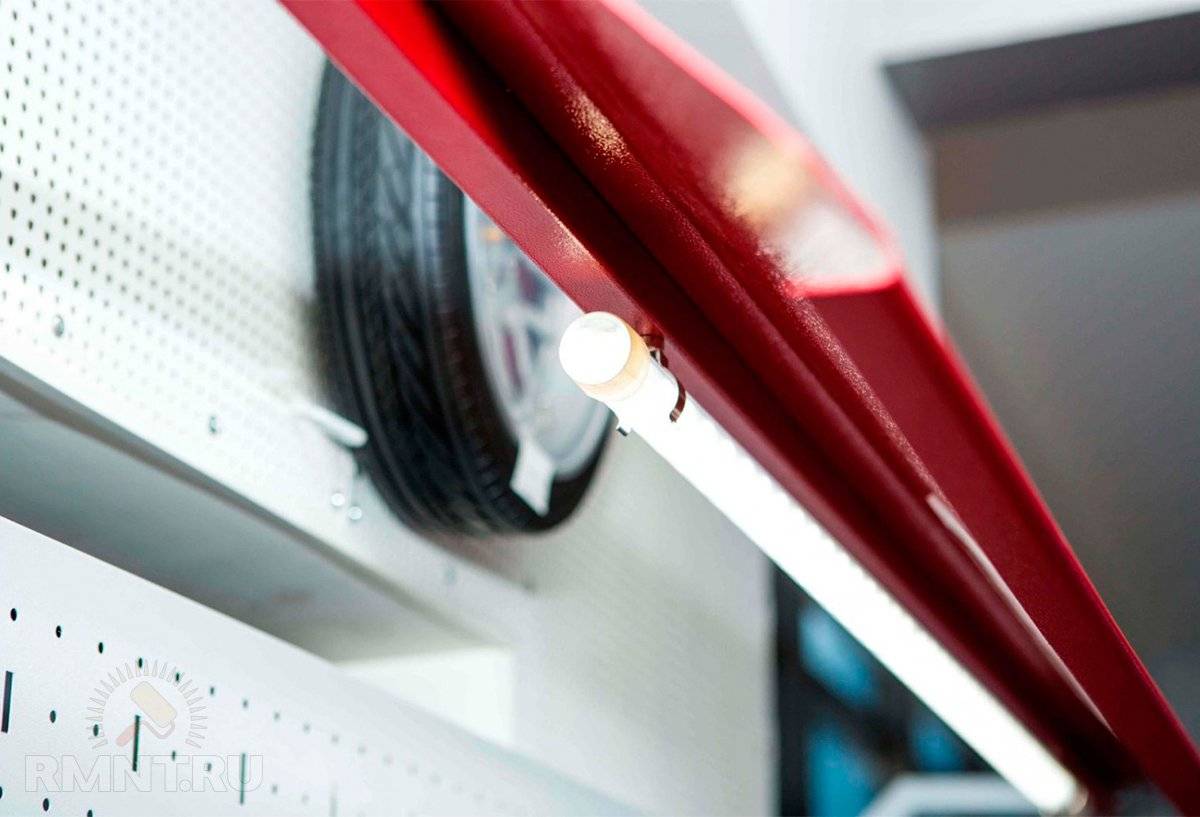 Необходимо присоединить верстак к общему заземляющему контуру гаража, прочно закрепить его на полу или стенах. Стеллажи и инструментальный щит с верхним ярусом прочно крепятся с помощью анкерных болтов к стенам. Шурупы в данном случае использовать нельзя.