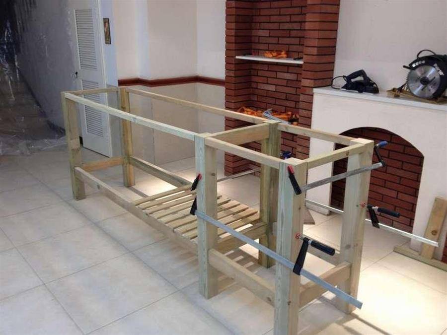 - После сборки каркаса изготавливается столешница из досок 50мм, их нарезают и закрепляют к каркасу.