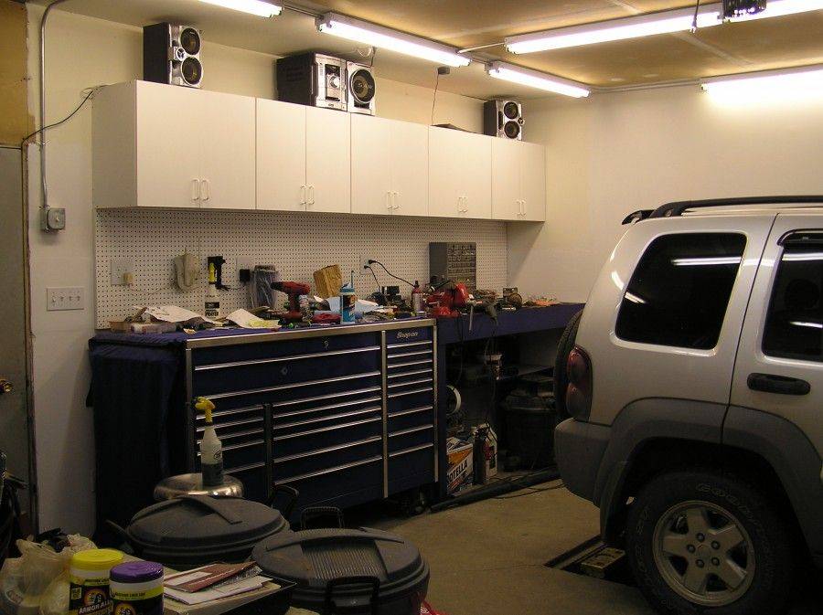 Освещение. Учитывая, что в гараже всегда имеются теневые зоны (от автомобиля, полок и стеллажей), практичным вариантом станет комбинированная система из нескольких источников света, предназначенных для разных задач. Над верстаком, в зоне проведения работ, удобно установить яркую поворотную лампу, защищенную абажуром. Лампу можно сделать съемной; также ее удобно встроить в верстак, а не закреплять на стене — если вы захотите передвинуть стол, проблем с электрификацией не возникнет.
