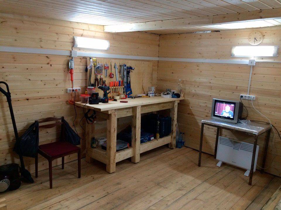 - Между тумбами рабочего стола в гараже зачастую помещают дополнительную полку. Подойдет листовая фанера толщиной 6-8 мм. Лучше взять 3 листа 0,6х2 м.