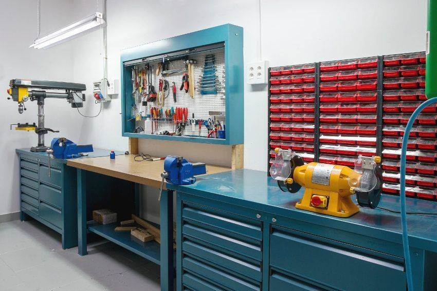 Функциональность рабочего стола в гараже зависит от его конструкции. Для удобства он оснащается дополнительными элементами. В зависимости от рода занятий, рабочее место в гараже включает: