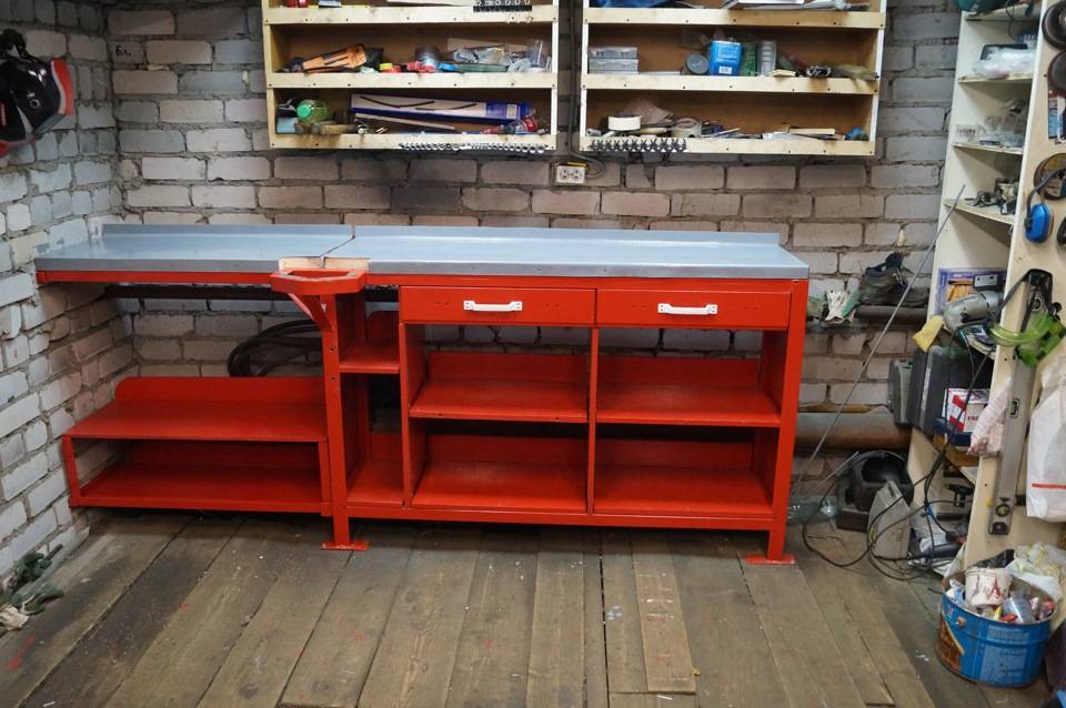 Каркас верстака из металла более прочен и удобен при работе с тяжелыми предметами. Конструкция обладает большей устойчивостью, и не будет прогибаться при сильном давлении на столешницу. Если гараж служит основным местом времяпровождения и достаточно свободной площади, для работы можно сделать две конструкции – слесарную и столярную.